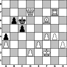 game notation in PGN-format [Event "Turnier f"] [Site "www.myChess.de"] [Date "2008.08.21"] [Round "1"] [White "andreas007"] [Black "alpacino"] [ECO "A40"] [WhitemyELO "1385"] [BlackmyELO "1302"] [Result "1-0"] [TimeControl "10/2592000"] [WhiteDays "149"] [BlackDays "148"] [MyChessNo "47279"] 1. d4 e6 2. Nf3 Nc6 3. c4 Bb4+ 4. Nc3 Bxc3+ 5. bxc3 Nf6 6. e3 O-O 7. Bd3 g6 8. O-O d5 9. cxd5 exd5 10. Ne5 Nxe5 11. dxe5 Ng4 12. f4 c6 13. h3 Nh6 14. c4 Be6 15. Ba3 Re8 16. Qb3 dxc4 17. Bxc4 Bxc4 18. Qxc4 Nf5 19. Qb3 b6 20. Rad1 Qc8 21. Rd3 c5 22. Rd1 Qc6 23. Rd7 Rf8 24. Bb2 Nh4 25. Qd5 Qxd5 26. R1xd5 Nf5 27. Kf2 Rfc8 28. g4 Nh4 29. e6 Kf8 30. Rxf7+ Ke8 31. Rdd7 Rd8 32. Rxh7 Rxd7 33. exd7+ Kd8 34. Bf6+ Kc7 35. d8=Q+ Kc6 36. Qxa8+ Kb5 37. Rxh4 a5 38. Rh6 a4 39. Rxg6 Kb4 40. Qe4+ Kb5 41. a3 Ka6 42. Rg7 Kb5 43. Qd3+ Kc6 44. Qd7# 1-0 position notation in FEN-format 8/3Q2R1/1pk2B2/2p5/p4PP1/P3P2P/3P1K2/8 - - - 6 44 Captured white pieces: ![]() ![]() ![]() ![]() ![]() ![]() ![]() ![]() ![]() ![]() ![]() ![]() ![]() ![]() ![]() Captured black pieces: ![]() ![]() ![]() ![]() ![]() ![]() ![]() ![]() ![]() ![]() ![]() ![]() ![]() ![]() ![]() Click on a captured piece in order to display the desired move!