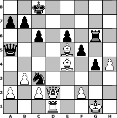 game notation in PGN-format [Event "2. Norderstedter DENK MAL Open 2011"] [Site "www.myChess.de"] [Date "2011.06.02"] [Round "1"] [White "73DADDELDU37"] [Black "morchel"] [ECO "A01"] [WhitemyELO "1495"] [BlackmyELO "1493"] [Result "1-0"] [TimeControl "10/2592000"] [WhiteDays "29"] [BlackDays "28"] [MyChessNo "74305"] 1. b3 d5 2. Bb2 Bg4 3. h3 Bh5 4. g4 Bg6 5. Bg2 e6 6. Nf3 Nf6 7. Ne5 Nbd7 8. d3 Bd6 9. Nf3 c6 10. O-O Qc7 11. Nbd2 h6 12. e4 dxe4 13. dxe4 Bf4 14. Qe2 O-O-O 15. Nc4 Nc5 16. Rad1 Nfxe4 17. Bxg7 Rhg8 18. Rxd8+ Qxd8 19. Bb2 f5 20. Nce5 h5 21. Nxg6 Rxg6 22. Ne5 Bxe5 23. Bxe5 hxg4 24. Rd1 Qa5 25. h4 Nc3 26. Qd2 N5e4 27. Bxe4 1-0 position notation in FEN-format 2k5/pp6/2p1p1r1/q3Bp2/4B1pP/1Pn5/P1PQ1P2/3R2K1 - - - 0 27 Captured white pieces: ![]() ![]() ![]() ![]() ![]() ![]() ![]() ![]() ![]() ![]() ![]() ![]() ![]() ![]() ![]() Captured black pieces: ![]() ![]() ![]() ![]() ![]() ![]() ![]() ![]() ![]() ![]() ![]() ![]() ![]() ![]() ![]() Click on a captured piece in order to display the desired move!