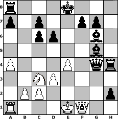 game notation in PGN-format [Event "CAISSA.COM IS DEAD TO ME!"] [Site "www.myChess.de"] [Date "2020.03.28"] [Round "1"] [White "lotchi"] [Black "deepsabel"] [ECO "C48"] [WhitemyELO "1273"] [BlackmyELO "1816"] [Result "0-1"] [TimeControl "10/2592000"] [WhiteDays "29"] [BlackDays "30"] [MyChessNo "117714"] 1. e4 e5 2. Nf3 Nc6 3. Nc3 Nf6 4. Bb5 d6 5. Bxc6+ bxc6 6. d3 Be7 7. Be3 Bg4 8. h3 Bh5 9. g4 Bg6 10. O-O Qd7 11. a4 h5 12. Ng5 hxg4 13. Kh2 gxh3 14. f4 Ng4+ 15. Kg3 Nxe3 16. Qe2 Nxf1+ 17. Qxf1 exf4+ 18. Kxf4 Rh4+ 19. Ke3 Bxg5+ 20. Ke2 Qg4+ 21. Ke1 h2 0-1 position notation in FEN-format r3k3/p1p2pp1/2pp2b1/6b1/P3P1qr/2NP4/1PP4p/R3KQ2 - q - 0 22 Captured white pieces: Captured black pieces: Click on a captured piece in order to display the desired move!