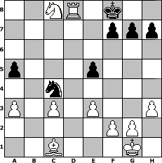 game notation in PGN-format [Event "Gegen die Herbstdepression"] [Site "www.myChess.de"] [Date "2008.12.01"] [Round "1"] [White "andreas007"] [Black "gunni50"] [ECO "D24"] [WhitemyELO "1402"] [BlackmyELO "1482"] [Result "1-0"] [TimeControl "10/864000"] [WhiteDays "10"] [BlackDays "10"] [MyChessNo "50344"] 1. d4 d5 2. c4 dxc4 3. Nf3 Nf6 4. Nc3 Bg4 5. e3 e6 6. Bxc4 Bb4 7. O-O O-O 8. Be2 Nc6 9. a3 Bxc3 10. bxc3 Ne4 11. Bb2 Qd6 12. h3 Bh5 13. Nh4 Bxe2 14. Qxe2 Na5 15. Qc2 Qd5 16. Nf3 c5 17. Rad1 cxd4 18. Rxd4 Qf5 19. Rxe4 Nc4 20. Qb1 b5 21. Rd4 Qxb1 22. Rxb1 Rad8 23. Rxd8 Rxd8 24. Nd4 e5 25. Nxb5 a6 26. Na7 Rb8 27. Nc6 Rc8 28. Ne7+ Kf8 29. Nxc8 Nd2 30. Rd1 Nc4 31. Bc1 a5 32. Rd8# 1-0 position notation in FEN-format 2NR1k2/5ppp/8/p3p3/2n5/P1P1P2P/5PP1/2B3K1 - - - 1 32 Captured white pieces: ![]() ![]() ![]() ![]() ![]() ![]() ![]() ![]() ![]() ![]() ![]() ![]() ![]() ![]() ![]() Captured black pieces: ![]() ![]() ![]() ![]() ![]() ![]() ![]() ![]() ![]() ![]() ![]() ![]() ![]() ![]() ![]() Click on a captured piece in order to display the desired move!