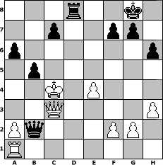 game notation in PGN-format [Event "Albspiele II"] [Site "www.myChess.de"] [Date "2010.01.10"] [Round "1"] [White "paul"] [Black "Knight"] [ECO "C48"] [WhitemyELO "1300"] [BlackmyELO "1115"] [Result "0-1"] [TimeControl "10/2592000"] [WhiteDays "29"] [BlackDays "30"] [MyChessNo "62278"] 1. e4 e5 2. Nf3 Nc6 3. Nc3 Nf6 4. Bb5 a6 5. Bxc6 dxc6 6. d3 Bb4 7. Nxe5 O-O 8. Bg5 Bg4 9. Nf3 Bxc3+ 10. bxc3 h6 11. Bxf6 Qxf6 12. h3 Bxf3 13. Qxf3 Qxc3+ 14. Ke2 Qxc2+ 15. Ke3 Rfd8 16. d4 c5 17. Rhd1 cxd4+ 18. Rxd4 Rxd4 19. Kxd4 Qb2+ 20. Qc3 Rd8+ 21. Kc4 b5+ 0-1 position notation in FEN-format 3r2k1/2p2pp1/p6p/1p6/2K1P3/2Q4P/Pq3PP1/R7 - - - 0 22 Captured white pieces: Captured black pieces: Click on a captured piece in order to display the desired move!