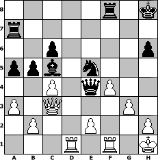 game notation in PGN-format [Event "Sommer 2015"] [Site "www.myChess.de"] [Date "2015.06.16"] [Round "1"] [White "alibengali"] [Black "Robur"] [ECO "B03"] [WhitemyELO "1685"] [BlackmyELO "1836"] [Result "0-1"] [TimeControl "10/1728000"] [WhiteDays "42"] [BlackDays "37"] [MyChessNo "99491"] 1. e4 Nf6 2. e5 Nd5 3. d4 e6 4. Nf3 d6 5. c4 Nb6 6. Nc3 Be7 7. Bd3 N8d7 8. O-O dxe5 9. Nxe5 Nxe5 10. dxe5 Nd7 11. f4 Bc5+ 12. Kh1 O-O 13. Qc2 h6 14. a3 a5 15. Nb5 f6 16. exf6 Nxf6 17. Bd2 Ng4 18. Bc3 c6 19. Rad1 Qh4 20. g3 Qh3 21. Nc7 Ra7 22. Bh7+ Kh8 23. Ne8 e5 24. Nxg7 b5 25. Bxe5 Nxe5 26. Bf5 Bxf5 27. Nxf5 Qxf5 28. Qc3 Qe4+ 0-1 position notation in FEN-format 5r1k/r7/2p4p/ppb1n3/2P1qP2/P1Q3P1/1P2P2P/3R1R1K - - - 2 29 Captured white pieces: Captured black pieces: Click on a captured piece in order to display the desired move!