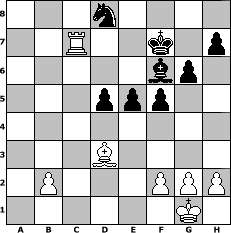 game notation in PGN-format [Event "Gewitter im August"] [Site "www.myChess.de"] [Date "2006.08.13"] [Round "1"] [White "zoli"] [Black "Zoidberg"] [ECO "C02"] [WhitemyELO "1603"] [BlackmyELO "1900"] [Result "1-0"] [TimeControl "10/864000"] [WhiteDays "32"] [BlackDays "13"] [MyChessNo "27645"] 1. e4 e6 2. d4 d5 3. e5 c5 4. Nf3 Nc6 5. Bd3 cxd4 6. O-O Nge7 7. Qe2 Ng6 8. c3 dxc3 9. Nxc3 Bd7 10. Bd2 Be7 11. Rac1 O-O 12. Rfe1 a6 13. Bc2 b5 14. Qe3 Rc8 15. Ne2 Nh4 16. Nxh4 Bxh4 17. Nf4 f5 18. Bd3 Be7 19. Be2 Bg5 20. Qg3 Bh4 21. Qa3 Nxe5 22. Qxa6 Ra8 23. Qd6 Nf7 24. Qc5 Rxa2 25. Nd3 Bf6 26. Bb4 Ra8 27. Qxf8+ Qxf8 28. Bxf8 Kxf8 29. Nc5 Rd8 30. Nxd7+ Rxd7 31. Bxb5 Rb7 32. Rc8+ Nd8 33. Bd3 Kf7 34. Re2 g6 35. Rec2 e5 36. R8c7+ Rxc7 37. Rxc7+ 1-0 position notation in FEN-format 3n4/2R2k1p/5bp1/3ppp2/8/3B4/1P3PPP/6K1 - - - 0 37 Captured white pieces: Captured black pieces: Click on a captured piece in order to display the desired move!
