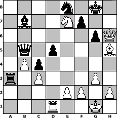 | game notation in PGN-format [Event "Wrixum Open die II."] [Site "www.myChess.de"] [Date "2005.06.22"] [Round "1"] [White "bane"] [Black "Andreas"] [ECO "A00"] [WhitemyELO "1875"] [BlackmyELO "1648"] [Result "1-0"] [TimeControl "10/1728000"] [WhiteDays "80"] [BlackDays "43"] [MyChessNo "14401"] 1. g3 e5 2. d4 exd4 3. Qxd4 Nc6 4. Qe4+ Be7 5. Qg4 d5 6. Qa4 Nf6 7. Nf3 O-O 8. Bg2 a6 9. O-O b5 10. Qb3 Bb7 11. Bg5 Na5 12. Qd3 c5 13. c3 Nc4 14. b3 Nd6 15. Nbd2 h6 16. Bf4 c4 17. Qc2 Rc8 18. b4 Nde4 19. Rfd1 Qb6 20. Be3 Qc7 21. a4 Ng4 22. Bd4 Bf6 23. Bxf6 Ngxf6 24. axb5 axb5 25. Nd4 Nxd2 26. Qxd2 Qd7 27. Ra7 Rc7 28. Qf4 Rfc8 29. Nf5 Qe6 30. Bf3 Qb6 31. Ra5 Ra8 32. Rxb5 Qxb5 33. Qxc7 Ra3 34. Qb8+ Kh7 35. Qf8 Ne8 36. Bh5 g6 37. Qxh6+ Kg8 38. Ne7# 1-0 position notation in FEN-format 4n1k1/1b2Np2/6pQ/1q1p3B/1Pp5/r1P3P1/4PP1P/3R2K1 - - - 2 38 Captured white pieces:                              Captured black pieces:                               Click on a captured piece in order to display the desired move!
