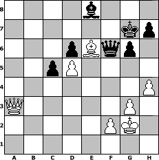 game notation in PGN-format [Event "Schach on the beach"] [Site "www.myChess.de"] [Date "2015.05.21"] [Round "1"] [White "Cuibono"] [Black "Erich"] [ECO "E17"] [WhitemyELO "2019"] [BlackmyELO "2100"] [Result "1/2-1/2"] [TimeControl "10/2592000"] [WhiteDays "125"] [BlackDays "150"] [MyChessNo "99308"] 1. d4 Nf6 2. c4 e6 3. Nf3 b6 4. g3 Bb7 5. Bg2 Be7 6. O-O O-O 7. Re1 Na6 8. Nc3 Ne4 9. Bf4 d6 10. Qc2 Nb4 11. Qc1 Nxc3 12. Qxc3 c5 13. a3 Nc6 14. d5 Nd4 15. Bd2 Bf6 16. Nxd4 Bxd4 17. Qc2 Qd7 18. a4 Rae8 19. e3 Bf6 20. Bc3 Bxc3 21. Qxc3 exd5 22. cxd5 f5 23. b4 Rc8 24. a5 Rc7 25. axb6 axb6 26. bxc5 bxc5 27. Reb1 Ra8 28. Rxa8+ Bxa8 29. Qc4 Rb7 30. Ra1 Ra7 31. Rxa7 Qxa7 32. Qh4 Qc7 33. Qa4 Qd8 34. e4 fxe4 35. Qxe4 Bb7 36. Bh3 Kh8 37. Be6 Ba6 38. h4 Bb5 39. Bf5 g6 40. Be6 Qf6 41. Qe3 Be8 42. Kg2 Kg7 43. Qa3 1/2-1/2 position notation in FEN-format 4b3/6kp/3pBqp1/2pP4/7P/Q5P1/5PK1/8 - - - 7 43 Captured white pieces: Captured black pieces: Click on a captured piece in order to display the desired move!