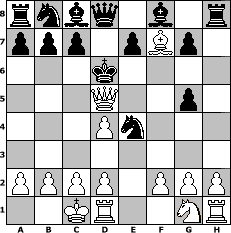 game notation in PGN-format [Event "Emil-Josef Diemer"] [Site "www.myChess.de"] [Date "2017.09.06"] [Round "1"] [White "lisama"] [Black "Haneken"] [ECO "D00"] [WhitemyELO "1502"] [BlackmyELO "1051"] [Result "1-0"] [TimeControl "10/2592000"] [WhiteDays "60"] [BlackDays "59"] [MyChessNo "109501"] 1. d4 d5 2. e4 dxe4 3. Nc3 f5 4. Bg5 h6 5. Qh5+ Kd7 6. Bc4 Qe8 7. Bf7 Qd8 8. Qg6 Nf6 9. O-O-O hxg5 10. Qxf5+ Kc6 11. Qb5+ Kd6 12. Nxe4+ Nxe4 13. Qd5# 1-0 position notation in FEN-format rnbq1b1r/ppp1pBp1/3k4/3Q2p1/3Pn3/8/PPPP1PPP/2KR2NR - - - 1 13 Captured white pieces: Captured black pieces: Click on a captured piece in order to display the desired move!