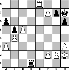 game notation in PGN-format [Event "2016"] [Site "www.myChess.de"] [Date "2016.01.01"] [Round "1"] [White "Joschi"] [Black "Master1"] [ECO "B18"] [WhitemyELO "1564"] [BlackmyELO "1255"] [Result "1-0"] [TimeControl "10/2592000"] [WhiteDays "30"] [BlackDays "24"] [MyChessNo "101946"] 1. e4 c6 2. d4 d5 3. Nc3 dxe4 4. Nxe4 Bf5 5. Ng3 Be6 6. Nf3 Nf6 7. Be2 Nbd7 8. O-O h6 9. c4 Nb6 10. b3 Bg4 11. h3 Bxf3 12. Bxf3 e6 13. Re1 Bb4 14. Re2 e5 15. Bb2 O-O 16. a3 Be7 17. dxe5 Ne8 18. Nf5 Qxd1+ 19. Rxd1 Bd8 20. c5 Nd5 21. Bxd5 cxd5 22. Rxd5 Nc7 23. Rd7 Ne6 24. b4 Rb8 25. Nd4 Nxd4 26. Bxd4 Bg5 27. Be3 Bxe3 28. Rxe3 a6 29. Rg3 b5 30. e6 Rbd8 31. exf7+ Kh8 32. Rxd8 Rxd8 33. Re3 Kh7 34. Re8 Rd1+ 35. Kh2 1-0 position notation in FEN-format 4R3/5Ppk/p6p/1pP5/1P6/P6P/5PPK/3r4 - - - 5 35 Captured white pieces: Captured black pieces: Click on a captured piece in order to display the desired move!
