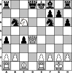 game notation in PGN-format [Event "CCF Turnier"] [Site "www.myChess.de"] [Date "2005.09.27"] [Round "1"] [White "bane"] [Black "MichaelKnopf"] [ECO "B01"] [WhitemyELO "1814"] [BlackmyELO "1682"] [Result "1-0"] [TimeControl "10/2592000"] [WhiteDays "60"] [BlackDays "60"] [MyChessNo "17890"] 1. e4 d5 2. exd5 Qxd5 3. Nc3 Qd8 4. Bb5+ c6 5. Ba4 Nf6 6. Nf3 a5 7. O-O b5 8. Nxb5 cxb5 9. Bxb5+ Bd7 10. Bxd7+ Nbxd7 11. d4 h6 12. d5 Nb6 13. c4 a4 14. Qd4 e6 15. Ne5 exd5 16. Re1 dxc4 17. Nc6+ 1-0 position notation in FEN-format r2qkb1r/5pp1/1nN2n1p/8/p1pQ4/8/PP2PPPP/R1B1R1K1 - kq - 1 17 Captured white pieces: Captured black pieces: Click on a captured piece in order to display the desired move!
