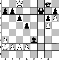 game notation in PGN-format [Event "Kleines Herbstturnier"] [Site "www.myChess.de"] [Date "2004.10.28"] [Round "2"] [White "Falcor"] [Black "Robur"] [ECO "A83"] [WhitemyELO "1222"] [BlackmyELO "1634"] [Result "1/2-1/2"] [TimeControl "10/2592000"] [WhiteDays "102"] [BlackDays "091"] [MyChessNo "7652"] 1. d4 f5 2. e4 fxe4 3. Nc3 Nf6 4. Bg5 c6 5. f3 exf3 6. Nxf3 d6 7. Bd3 Bg4 8. Qe2 Nbd7 9. h3 Bxf3 10. Qxf3 e5 11. dxe5 Nxe5 12. Qe3 Be7 13. O-O-O O-O 14. Bxf6 Nxd3+ 15. Qxd3 Rxf6 16. g4 d5 17. g5 Re6 18. h4 Bc5 19. Ne2 Qe7 20. Nf4 Be3+ 21. Kb1 Bxf4 22. Rhf1 Bc7 23. a3 Re3 24. Qd4 Bb6 25. Qf4 Rf8 26. Qg4 Rxf1 27. Rxf1 Re1+ 28. Rxe1 Qxe1+ 29. Ka2 Qe8 30. h5 g6 31. h6 Bc5 32. Qf4 Be3 33. Qf6 Qf8 34. Qe6+ Qf7 35. Qc8+ 1/2-1/2 position notation in FEN-format 2Q3k1/pp3q1p/2p3pP/3p2P1/8/P3b3/KPPP4/8 - - - 8 35 Captured white pieces: Captured black pieces: Click on a captured piece in order to display the desired move!