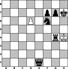 game notation in PGN-format [Event "Albspiele 17"] [Site "www.myChess.de"] [Date "2011.12.02"] [Round "1"] [White "alpacino"] [Black "faustballer"] [ECO "C41"] [WhitemyELO "1280"] [BlackmyELO "1479"] [Result "0-1"] [TimeControl "10/864000"] [WhiteDays "53"] [BlackDays "60"] [MyChessNo "77885"] 1. e4 e5 2. Nf3 d6 3. Nc3 Nf6 4. d3 Bg4 5. Be2 h6 6. O-O a6 7. Nd2 Bd7 8. Nc4 b5 9. Ne3 Be7 10. Nf5 Bxf5 11. exf5 Nc6 12. Be3 d5 13. d4 e4 14. a3 Qd7 15. Bg4 h5 16. Bh3 Na5 17. b3 Nc6 18. Re1 b4 19. axb4 Bxb4 20. Na4 Bxe1 21. Qxe1 Ne7 22. Nc5 Qc8 23. b4 Nxf5 24. Bxf5 Qxf5 25. Rxa6 Rxa6 26. Nxa6 c6 27. Nc7+ Kd7 28. Na6 Ra8 29. Nc5+ Ke8 30. Qb1 Kf8 31. b5 cxb5 32. c3 Kg8 33. Nb7 Qc8 34. Nd6 Qa6 35. Kf1 Qxd6 36. Qxb5 Qxh2 37. Ke2 Ra2+ 38. Bd2 Qxg2 39. Qb8+ Kh7 40. Qf4 Qg4+ 41. Ke3 Qxf4+ 42. Kxf4 Rxd2 43. f3 Rc2 44. fxe4 dxe4 45. d5 Rxc3 46. d6 e3 47. Kf3 h4 48. Kg2 h3+ 49. Kxh3 e2+ 50. Kh4 e1=Q+ 51. Kg5 Rg3+ 52. Kh4 Rg4+ 0-1 position notation in FEN-format 8/5ppk/3P1n2/8/6rK/8/8/4q3 - - - 4 53 Captured white pieces: Captured black pieces: Click on a captured piece in order to display the desired move!