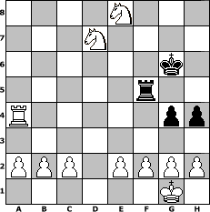 game notation in PGN-format [Event "Nu abba los ..."] [Site "www.myChess.de"] [Date "2005.03.20"] [Round "1"] [White "Andylein1989"] [Black "Hobbykegler"] [ECO "C68"] [WhitemyELO "1298"] [BlackmyELO "1114"] [Result "1-0"] [TimeControl "10/1728000"] [WhiteDays "77"] [BlackDays "50"] [MyChessNo "11331"] 1. e4 e5 2. Nf3 Nc6 3. Bb5 a6 4. Bxc6 dxc6 5. d4 f6 6. O-O Bg4 7. dxe5 fxe5 8. Qxd8+ Rxd8 9. Nxe5 Be6 10. Nc3 Bd6 11. Nf3 Nf6 12. e5 Bxe5 13. Nxe5 Rf8 14. Bg5 h6 15. Bxf6 Rxf6 16. Rad1 Rf5 17. Rxd8+ Kxd8 18. Rd1+ Ke7 19. Ng6+ Kf6 20. Nf8 Bf7 21. Rd7 g5 22. Rxc7 g4 23. Rxb7 h5 24. Rb6 h4 25. Rxc6+ Ke5 26. Nd7+ Kf4 27. Rxa6 Be8 28. Ra4+ Kg5 29. Ne4+ Kh5 30. Nef6+ Kg6 31. Nxe8 1-0 position notation in FEN-format 4N3/3N4/6k1/5r2/R5pp/8/PPP1PPPP/6K1 - - - 0 31 Captured white pieces: Captured black pieces: Click on a captured piece in order to display the desired move!