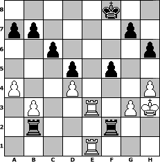 game notation in PGN-format [Event "Sommer 2015"] [Site "www.myChess.de"] [Date "2015.06.16"] [Round "1"] [White "Gordholm"] [Black "FrankB"] [ECO "D15"] [WhitemyELO "1511"] [BlackmyELO "1694"] [Result "0-1"] [TimeControl "10/1728000"] [WhiteDays "43"] [BlackDays "72"] [MyChessNo "99481"] 1. d4 d5 2. c4 c6 3. Nf3 Nf6 4. Nc3 e6 5. Bg5 Be7 6. e3 Nbd7 7. Qc2 O-O 8. Bd3 h6 9. h4 dxc4 10. Bxc4 Nh7 11. Bf4 Nb6 12. Bb3 Nd5 13. Nxd5 exd5 14. Qd3 Bb4+ 15. Kf1 Bd6 16. Bc2 Nf6 17. Be5 Ne4 18. Nd2 Bf5 19. Nxe4 Bxe4 20. Qe2 Bxc2 21. Qxc2 Re8 22. Bxd6 Qxd6 23. g3 Qf6 24. Kg2 Re4 25. Qe2 Qxd4 26. exd4 Rxe2 27. b3 Rae8 28. Rhd1 R8e4 29. Rd3 Rb2 30. a4 Ree2 31. Rf3 Red2 32. Re1 Kf8 33. Rfe3 Rxf2+ 34. Kh3 f5 0-1 position notation in FEN-format 5k2/pp4p1/2p4p/3p1p2/P2P3P/1P2R1PK/1r3r2/4R3 - - - 0 35 Captured white pieces: Captured black pieces: Click on a captured piece in order to display the desired move!