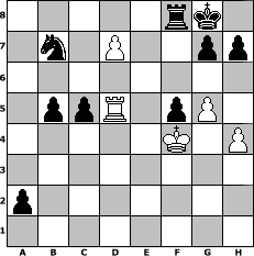 game notation in PGN-format [Event "STHLM"] [Site "www.myChess.de"] [Date "2010.03.25"] [Round "1"] [White "reisender"] [Black "Haneken"] [ECO "C42"] [WhitemyELO "1386"] [BlackmyELO "1443"] [Result "0-1"] [TimeControl "10/1728000"] [WhiteDays "100"] [BlackDays "074"] [MyChessNo "64288"] 1. e4 e5 2. Nf3 Nf6 3. d3 Nc6 4. Bd2 Bc5 5. Be2 d5 6. O-O dxe4 7. Ng5 exd3 8. Bxd3 Bg4 9. Be2 Qd4 10. c3 Qd7 11. b4 Bd6 12. b5 Na5 13. f3 Bf5 14. a4 O-O 15. c4 Bc5+ 16. Kh1 Bd4 17. Nc3 c5 18. Ra3 Rad8 19. Nce4 Nxe4 20. Nxe4 Qc7 21. Qe1 Bxe4 22. fxe4 b6 23. Qg3 Bf2 24. Rxf2 Rxd2 25. Raf3 Rd4 26. Rf5 Nxc4 27. Bd3 Na5 28. Rxe5 Rxd3 29. Qxd3 Qxe5 30. h3 Qa1+ 31. Kh2 Qxa4 32. Qd7 a6 33. e5 Qxb5 34. e6 Qxd7 35. exd7 Nc4 36. Re2 Nd6 37. Rd2 Nb7 38. g4 a5 39. Kg3 a4 40. h4 a3 41. g5 f5 42. Kf4 b5 43. Rd5 a2 0-1 position notation in FEN-format 5rk1/1n1P2pp/8/1ppR1pP1/5K1P/8/p7/8 - - - 0 44 Captured white pieces: Captured black pieces: Click on a captured piece in order to display the desired move!