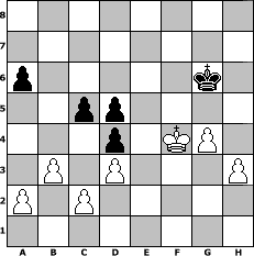 game notation in PGN-format [Event "Osterei 2015"] [Site "www.myChess.de"] [Date "2015.04.05"] [Round "1"] [White "alibengali"] [Black "Rotstift10"] [ECO "A01"] [WhitemyELO "1671"] [BlackmyELO "1598"] [Result "1-0"] [TimeControl "10/2592000"] [WhiteDays "99"] [BlackDays "88"] [MyChessNo "98839"] 1. b3 e5 2. Bb2 Nc6 3. e3 d5 4. Bb5 a6 5. Bxc6+ bxc6 6. Bxe5 Nf6 7. h3 Bd6 8. Bb2 O-O 9. Nf3 h6 10. O-O Bf5 11. Nd4 Qd7 12. Nxf5 Qxf5 13. Nc3 c5 14. d3 Qe5 15. g3 Qf5 16. Kh2 d4 17. e4 Qh5 18. Qxh5 Nxh5 19. Ne2 Rad8 20. f4 g6 21. g4 Ng7 22. e5 Be7 23. f5 f6 24. Nf4 fxe5 25. Nxg6 Bf6 26. Nxf8 Kxf8 27. Ba3 Rd5 28. Bc1 Bg5 29. Bxg5 hxg5 30. f6 Ne6 31. Rf5 Kf7 32. Re1 c6 33. Kg3 Nf4 34. Rxg5 Kxf6 35. Rf5+ Kg6 36. Rfxe5 Rxe5 37. Rxe5 Nd5 38. Rxd5 cxd5 39. Kf4 1-0 position notation in FEN-format 8/8/p5k1/2pp4/3p1KP1/1P1P3P/P1P5/8 - - - 1 39 Captured white pieces: Captured black pieces: Click on a captured piece in order to display the desired move!