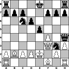 game notation in PGN-format [Event "Der Beste hinter den 1900ern(3/10) oder 10 hoch 2"] [Site "www.myChess.de"] [Date "2010.01.12"] [Round "1"] [White "Haki"] [Black "Kloetzchenschieber"] [ECO "A00"] [WhitemyELO "1374"] [BlackmyELO "1734"] [Result "0-1"] [TimeControl "10/864000"] [WhiteDays "10"] [BlackDays "10"] [MyChessNo "62342"] 1. b4 e5 2. Bb2 Bxb4 3. f4 d6 4. e4 Nc6 5. Nf3 Nf6 6. Nc3 Bxc3 7. Bxc3 Nxe4 8. Bb2 Bg4 9. h3 Bxf3 10. Qxf3 Qh4+ 11. Ke2 Ng3+ 0-1 position notation in FEN-format r3k2r/ppp2ppp/2np4/4p3/5P1q/5QnP/PBPPK1P1/R4B1R - kq - 3 12 Captured white pieces: Captured black pieces: Click on a captured piece in order to display the desired move!