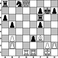 game notation in PGN-format [Event "101 Geburtstag von Miguel Najdorf"] [Site "www.myChess.de"] [Date "2011.04.15"] [Round "1"] [White "Grubengeist"] [Black "Haki"] [ECO "B90"] [WhitemyELO "1874"] [BlackmyELO "1243"] [Result "1-0"] [TimeControl "10/1728000"] [WhiteDays "71"] [BlackDays "77"] [MyChessNo "73298"] 1. e4 c5 2. Nf3 d6 3. d4 cxd4 4. Nxd4 Nf6 5. Nc3 a6 6. Bd3 e5 7. Nb3 Be6 8. O-O Be7 9. f4 Nc6 10. f5 Bxb3 11. axb3 O-O 12. Be3 Nb4 13. Bc4 b5 14. Be2 d5 15. exd5 Nbxd5 16. Nxd5 Nxd5 17. Bf2 e4 18. Re1 Bd6 19. Qd4 Re8 20. c4 e3 21. Bh4 Ne7 22. Qg4 Qd7 23. Rad1 Nc8 24. Bf6 g6 25. c5 Qxf5 26. Qxf5 gxf5 27. cxd6 Re6 28. d7 Rxf6 29. d8=Q+ Kg7 30. Bf3 1-0 position notation in FEN-format r1nQ4/5pkp/p4r2/1p3p2/8/1P2pB2/1P4PP/3RR1K1 - - - 2 30 Captured white pieces: Captured black pieces: Click on a captured piece in order to display the desired move!