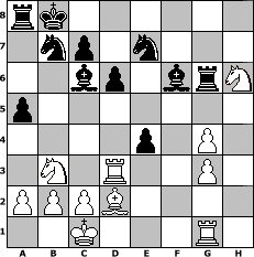 game notation in PGN-format [Event "3. HK-960-Pokal"] [Site "www.myChess.de"] [Date "2011.03.21"] [Round "1"] [White "Seneca"] [Black "haggard"] [Variant "Fischerrandom"] [SetUp "1"] [FEN "rknnbbrq/pppppppp/8/8/8/8/PPPPPPPP/RKNNBBRQ w KQkq - 0 1"] [WhitemyELO "1499"] [BlackmyELO "1942"] [Result "0-1"] [TimeControl "10/2592000"] [WhiteDays "30"] [BlackDays "30"] [MyChessNo "72920"] 1. g3 g5 2. Bg2 d6 3. Bxb7 Nxb7 4. Nb3 e6 5. h3 Ne7 6. d3 Bc6 7. Qh2 Bg7 8. e4 f5 9. f3 h5 10. Bc3 e5 11. Ne3 g4 12. hxg4 hxg4 13. Qxh8 Bxh8 14. fxg4 fxe4 15. O-O-O exd3 16. Rxd3 a5 17. Nf5 Bf6 18. Nh6 Rg6 19. Bd2 e4 0-1 position notation in FEN-format rk6/1np1n3/2bp1brN/p7/4p1P1/1N1R2P1/PPPB4/2K3R1 - q - 0 20 Captured white pieces: Captured black pieces: Click on a captured piece in order to display the desired move!