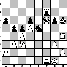 game notation in PGN-format [Event "Fr"] [Site "www.myChess.de"] [Date "2016.01.30"] [Round "1"] [White "beowulf"] [Black "borsti"] [ECO "A20"] [WhitemyELO "1346"] [BlackmyELO "1270"] [Result "1-0"] [TimeControl "10/2592000"] [WhiteDays "120"] [BlackDays "120"] [MyChessNo "102300"] 1. c4 e5 2. Nf3 d6 3. d4 exd4 4. Nxd4 h6 5. e4 Nf6 6. Nc3 c6 7. g3 g6 8. Bg2 c5 9. Nc2 a6 10. O-O Be6 11. Ne3 Nc6 12. Ned5 Nd4 13. Be3 Ng4 14. Qd2 Be7 15. Bxd4 Rh7 16. f3 Ne5 17. b3 Qa5 18. Be3 g5 19. f4 gxf4 20. Rxf4 Bg5 21. Rf2 Rg7 22. Bxg5 hxg5 23. Nf6+ Ke7 24. Nfd5+ Kf8 25. Raf1 Rd8 26. Nb1 Bxd5 27. Qxa5 Rd7 28. exd5 Rg6 29. Qd2 Kg7 30. Be4 Ng4 31. Bxg6 fxg6 32. Re2 Ne5 33. Qxg5 b5 34. Qf6+ Kh7 35. Nc3 Kh6 36. Re4 Rf7 37. Rh4# 1-0 position notation in FEN-format 8/5r2/p2p1Qpk/1ppPn3/2P4R/1PN3P1/P6P/5RK1 - - - 7 37 Captured white pieces: Captured black pieces: Click on a captured piece in order to display the desired move!