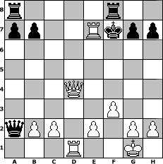 game notation in PGN-format [Event "Sei dabei am 1. Mai"] [Site "www.myChess.de"] [Date "2009.04.26"] [Round "1"] [White "kari6katz"] [Black "Knight"] [ECO "C24"] [WhitemyELO "1616"] [BlackmyELO "1059"] [Result "1-0"] [TimeControl "10/2592000"] [WhiteDays "30"] [BlackDays "30"] [MyChessNo "55192"] 1. e4 e5 2. Bc4 Nf6 3. d4 exd4 4. Nf3 Nc6 5. e5 Qe7 6. O-O Nxe5 7. Nxe5 Qxe5 8. Re1 Ne4 9. Qf3 f5 10. Nd2 d5 11. Nxe4 dxe4 12. Bf4 Qf6 13. Qg3 Bd6 14. f3 Bxf4 15. Qxf4 e3 16. Qxc7 f4 17. Rad1 Be6 18. Bxe6 Qxe6 19. Qxf4 Rf8 20. Qxd4 Kf7 21. Rxe3 Qxa2 22. Re7+ 1-0 position notation in FEN-format r4r2/pp2Rkpp/8/8/3Q4/5P2/qPP1P1PP/3R2K1 - - - 1 22 Captured white pieces: Captured black pieces: Click on a captured piece in order to display the desired move!