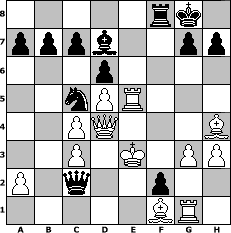game notation in PGN-format [Event "Ja, is denn heut scho Weihnachten?"] [Site "www.myChess.de"] [Date "2014.12.06"] [Round "1"] [White "Wernburger"] [Black "haggard"] [ECO "A22"] [WhitemyELO "1835"] [BlackmyELO "1992"] [Result "0-1"] [TimeControl "10/2592000"] [WhiteDays "75"] [BlackDays "90"] [MyChessNo "97067"] 1. c4 e5 2. Nc3 Nf6 3. Nf3 Nc6 4. e3 Bb4 5. Qc2 d6 6. d4 O-O 7. d5 Bxc3+ 8. bxc3 Nb8 9. e4 Na6 10. Be3 Ng4 11. Bg5 f6 12. Bc1 f5 13. h3 Nxf2 14. Bg5 Qe8 15. Kxf2 fxe4 16. Qxe4 Nc5 17. Qe3 e4 18. Re1 Qg6 19. Be7 Rf5 20. Rg1 Bd7 21. Bh4 Raf8 22. Qd4 exf3 23. g3 Re5 24. Rxe5 Qc2+ 25. Ke3 f2 0-1 position notation in FEN-format 5rk1/pppb2pp/3p4/2nPR3/2PQ3B/2P1K1PP/P1q2p2/5BR1 - - - 0 26 Captured white pieces: ![]() ![]() ![]() ![]() ![]() ![]() ![]() ![]() ![]() ![]() ![]() ![]() ![]() ![]() ![]() Captured black pieces: ![]() ![]() ![]() ![]() ![]() ![]() ![]() ![]() ![]() ![]() ![]() ![]() ![]() ![]() ![]() Click on a captured piece in order to display the desired move!