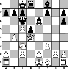 game notation in PGN-format [Event "f"] [Site "www.myChess.de"] [Date "2005.12.25"] [Round "1"] [White "Antaeus"] [Black "Vouivre"] [ECO "A10"] [WhitemyELO "1493"] [BlackmyELO "1428"] [Result "1-0"] [TimeControl "10/864000"] [WhiteDays "10"] [BlackDays "10"] [MyChessNo "21167"] 1. c4 d5 2. c5 Nc6 3. d4 Bf5 4. Nc3 Nf6 5. Nf3 e5 6. Nxe5 Nxe5 7. dxe5 Ng4 8. Qd4 Qd7 9. f3 Nh6 10. Bxh6 gxh6 11. e6 Bxe6 12. Qxh8 O-O-O 13. Qd4 Qc6 14. b4 1-0 position notation in FEN-format 2kr1b2/ppp2p1p/2q1b2p/2Pp4/1P1Q4/2N2P2/P1P1P1PP/R3KB1R - KQ - 0 14 Captured white pieces: Captured black pieces: Click on a captured piece in order to display the desired move!