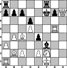 game notation in PGN-format [Event "Ja, is denn heut scho Weihnachten?"] [Site "www.myChess.de"] [Date "2014.12.06"] [Round "1"] [White "Winston"] [Black "MiFie"] [ECO "C44"] [WhitemyELO "1494"] [BlackmyELO "1052"] [Result "1-0"] [TimeControl "10/2592000"] [WhiteDays "57"] [BlackDays "51"] [MyChessNo "97026"] 1. e4 e5 2. Nf3 Nc6 3. a3 Nf6 4. Nc3 Bc5 5. b4 Bb6 6. Bc4 Ng4 7. d4 O-O 8. d5 Bxf2+ 9. Kf1 Nd4 10. Bb2 f5 11. Qd3 d6 12. h3 Nxf3 13. hxg4 fxe4 14. Nxe4 Bxg4 15. Nxf2 Qg5 16. Qxh7+ Kf7 17. gxf3 Bxf3 18. Rg1 e4 19. Rxg5 1-0 position notation in FEN-format r4r2/ppp2kpQ/3p4/3P2R1/1PB1p3/P4b2/1BP1PN2/R4K2 - - - 0 19 Captured white pieces: ![]() ![]() ![]() ![]() ![]() ![]() ![]() ![]() ![]() ![]() ![]() ![]() ![]() ![]() ![]() Captured black pieces: ![]() ![]() ![]() ![]() ![]() ![]() ![]() ![]() ![]() ![]() ![]() ![]() ![]() ![]() ![]() Click on a captured piece in order to display the desired move!