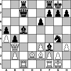 game notation in PGN-format [Event "Open II"] [Site "www.myChess.de"] [Date "2016.03.11"] [Round "1"] [White "Steffi"] [Black "Grubengeist"] [ECO "D11"] [WhitemyELO "1550"] [BlackmyELO "1971"] [Result "0-1"] [TimeControl "10/1728000"] [WhiteDays "52"] [BlackDays "23"] [MyChessNo "102895"] 1. d4 d5 2. c4 c6 3. Nf3 dxc4 4. Nc3 Nf6 5. e3 b5 6. a4 b4 7. Na2 e6 8. Bxc4 Be7 9. Qc2 O-O 10. Bd2 a5 11. O-O c5 12. Nc1 Bb7 13. dxc5 Nbd7 14. Nb3 Nxc5 15. Nxc5 Bxc5 16. Be2 Rc8 17. Qb3 Qc7 18. Rac1 Ng4 19. h3 Bxf3 0-1 position notation in FEN-format 2r2rk1/2q2ppp/4p3/p1b5/Pp4n1/1Q2Pb1P/1P1BBPP1/2R2RK1 - - - 0 20 Captured white pieces: ![]() ![]() ![]() ![]() ![]() ![]() ![]() ![]() ![]() ![]() ![]() ![]() ![]() ![]() ![]() Captured black pieces: ![]() ![]() ![]() ![]() ![]() ![]() ![]() ![]() ![]() ![]() ![]() ![]() ![]() ![]() ![]() Click on a captured piece in order to display the desired move!