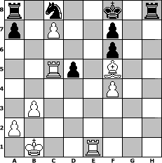 game notation in PGN-format [Event "fr"] [Site "www.myChess.de"] [Date "2011.10.14"] [Round "1"] [White "Fighter"] [Black "Schachfedi"] [ECO "B00"] [WhitemyELO "2162"] [BlackmyELO "1817"] [Result "1-0"] [TimeControl "10/1728000"] [WhiteDays "20"] [BlackDays "05"] [MyChessNo "76825"] 1. e4 Nc6 2. Nf3 Nf6 3. e5 Nd5 4. d4 d6 5. c4 Nb6 6. Nc3 Bg4 7. Be3 dxe5 8. d5 Nd4 9. Bxd4 Bxf3 10. gxf3 exd4 11. Qxd4 e6 12. O-O-O Qg5+ 13. f4 Qf6 14. Qxf6 gxf6 15. Bh3 e5 16. b3 Bh6 17. c5 Bxf4+ 18. Kb1 Nd7 19. c6 bxc6 20. dxc6 Nb6 21. Nb5 e4 22. Rhe1 O-O 23. Rxe4 Bxh2 24. Rh1 Be5 25. Rg4+ Kh8 26. Rh4 Rg8 27. f4 Bd6 28. Nxd6 cxd6 29. Bf5 Kg7 30. Rxh7+ Kf8 31. Rc1 Ke7 32. Rh2 d5 33. c7 Rh8 34. Re2+ Kd6 35. Rec2 Nc8 36. Rc6+ Ke7 37. Re1+ Kf8 38. Rc5 1-0 position notation in FEN-format r1n2k1r/p1P2p2/5p2/2Rp1B2/5P2/1P6/P7/1K2R3 - - - 10 38 Captured white pieces: Captured black pieces: Click on a captured piece in order to display the desired move!