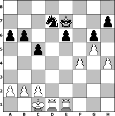 game notation in PGN-format [Event "MySchachOpen"] [Site "www.myChess.de"] [Date "2005.01.22"] [Round "1"] [White "Master1"] [Black "PublicEnemy"] [ECO "B01"] [WhitemyELO "1238"] [BlackmyELO "1233"] [Result "1-0"] [TimeControl "10/2592000"] [WhiteDays "90"] [BlackDays "83"] [MyChessNo "9859"] 1. e4 d5 2. exd5 Qxd5 3. Nc3 Qe5+ 4. Qe2 Qxe2+ 5. Ngxe2 e5 6. d4 exd4 7. Nxd4 Bc5 8. Be3 Nf6 9. Ndb5 Bb6 10. Bxb6 cxb6 11. Nc7+ Kd8 12. Nxa8 Re8+ 13. Be2 Bg4 14. f3 Bd7 15. O-O-O Nc6 16. Bb5 Re6 17. Nd5 a6 18. Nac7 Re7 19. Nxe7 Kxe7 20. Rhe1+ Be6 21. Bxc6 bxc6 22. Nxe6 fxe6 23. g4 c5 24. g5 Nd7 25. f4 g6 26. h4 1-0 position notation in FEN-format 8/3nk2p/pp2p1p1/2p3P1/5P1P/8/PPP5/2KRR3 - - - 0 26 Captured white pieces: Captured black pieces: Click on a captured piece in order to display the desired move!