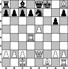 | game notation in PGN-format [Event "Schach f"] [Site "www.myChess.de"] [Date "2008.11.01"] [Round "1"] [Board "2"] [White "Papale"] [Black "Andylein1989"] [ECO "C29"] [WhitemyELO "1778"] [BlackmyELO "1745"] [Result "1-0"] [TimeControl "10/2592000"] [WhiteDays "28"] [BlackDays "30"] [MyChessNo "49338"] 1. e4 e5 2. Nc3 Nf6 3. f4 exf4 4. e5 Qe7 5. Qe2 Ng8 6. d4 f6 7. Bxf4 Nc6 8. O-O-O fxe5 9. dxe5 g6 10. Nf3 Bg7 11. Nd5 Qd8 12. Bg5 Nge7 13. Nf6+ Kf8 14. Nd4 Nxd4 15. Rxd4 Bxf6 16. Bxf6 Qe8 17. Bxh8 1-0 position notation in FEN-format r1b1qk1B/ppppn2p/6p1/4P3/3R4/8/PPP1Q1PP/2K2B1R - - - 0 17 Captured white pieces:                              Captured black pieces:                               Click on a captured piece in order to display the desired move!