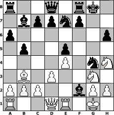 game notation in PGN-format [Event "U1300"] [Site "www.myChess.de"] [Date "2011.02.21"] [Round "1"] [White "Steppenwolf"] [Black "Knight"] [ECO "C70"] [WhitemyELO "1161"] [BlackmyELO "1169"] [Result "0-1"] [TimeControl "10/2592000"] [WhiteDays "46"] [BlackDays "60"] [MyChessNo "72218"] 1. e4 e5 2. Nf3 Nc6 3. Bb5 a6 4. Ba4 b5 5. Bb3 Nf6 6. d3 Bb7 7. O-O Bc5 8. Re1 O-O 9. Bg5 h6 10. Bh4 g5 11. Nc3 gxh4 12. Nxh4 Ne7 13. Ne2 Ng4 14. Ng3 Bxf2+ 0-1 position notation in FEN-format r2q1rk1/1bppnp2/p6p/1p2p3/4P1nN/1B1P2N1/PPP2bPP/R2QR1K1 - - - 0 15 Captured white pieces: Captured black pieces: Click on a captured piece in order to display the desired move!