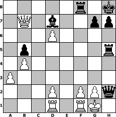 game notation in PGN-format [Event "Dabei ist alles 4"] [Site "www.myChess.de"] [Date "2008.08.25"] [Round "1"] [White "Ostseeboy"] [Black "Caligula"] [ECO "D30"] [WhitemyELO "1318"] [BlackmyELO "1428"] [Result "0-1"] [TimeControl "10/864000"] [WhiteDays "10"] [BlackDays "10"] [MyChessNo "47488"] 1. d4 d5 2. c4 e6 3. e3 Nf6 4. Nf3 c5 5. Be2 Be7 6. O-O O-O 7. cxd5 Qxd5 8. Nc3 Qd8 9. dxc5 Bxc5 10. a3 Nc6 11. Bb5 Bd7 12. b4 Bb6 13. Bb2 a6 14. Ba4 Bc7 15. e4 b5 16. Bb3 Bb6 17. Qc2 e5 18. Nd5 Nxd5 19. exd5 Nd4 20. Nxd4 exd4 21. Qe4 Re8 22. Qf3 Qe7 23. Rad1 Qe5 24. d6 Rf8 25. Bxf7+ Kh8 26. Qd5 Qf6 27. Bxd4 Bxd4 28. Bh5 Rae8 29. Qxd4 Re5 30. Qb6 Rxh5 31. Qxa6 Qf4 32. Qb7 Qxh2# 0-1 position notation in FEN-format 5r1k/1Q1b2pp/3P4/1p5r/1P6/P7/3P1PPq/3R1RK1 - - - 0 33 Captured white pieces: Captured black pieces: Click on a captured piece in order to display the desired move!