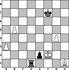 game notation in PGN-format [Event "2. Chess960/1"] [Site "www.myChess.de"] [Date "2008.03.15"] [Round "1"] [White "BirdofPray1"] [Black "Knoeppel@"] [Variant "Fischerrandom"] [SetUp "1"] [FEN "rqnbbknr/pppppppp/8/8/8/8/PPPPPPPP/RQNBBKNR w KQkq - 0 1"] [WhitemyELO "2240"] [BlackmyELO "1500"] [Result "0-1"] [TimeControl "10/3456000"] [WhiteDays "121"] [BlackDays "143"] [MyChessNo "43411"] 1. c4 Nf6 2. d4 d6 3. Nf3 c5 4. dxc5 dxc5 5. Nd3 Nd6 6. O-O O-O 7. Bc2 Nxc4 8. Nxc5 Ne5 9. Ne4 Nxf3+ 10. exf3 Nd5 11. Bd2 e6 12. Nc3 Nf6 13. Ne4 Nxe4 14. fxe4 Bc7 15. e5 Bxe5 16. Bxh7+ Kh8 17. f4 Qd6 18. fxe5 Qxd2 19. Be4 Qd4+ 20. Rf2 Rd8 21. Bxb7 Qxe5 22. Qe1 Qd4 23. Kh1 Bb5 24. Bf3 e5 25. Be4 Kg8 26. b4 Rd6 27. h3 Bc4 28. Rc1 Be6 29. Bf5 Bd5 30. a3 Rfd8 31. Rf1 e4 32. Rf4 Re8 33. Rc5 g6 34. Bg4 Red8 35. Kh2 f5 36. Be2 Qe3 37. Qg3 Qxg3+ 38. Kxg3 Be6 39. Rf2 Rd2 40. Re5 Bf7 41. Ba6 Kg7 42. Re7 Kf6 43. Rxa7 e3 44. Re2 g5 45. Rxf7+ Kxf7 46. Kf3 f4 47. g3 Ra8 48. b5 g4+ 49. hxg4 fxg3 50. Re1 g2 51. Kg3 Rh8 52. Bb7 Rh1 53. Rxh1 gxh1=N+ 54. Bxh1 e2 55. Kf2 Rd1 0-1 position notation in FEN-format 8/5k2/8/1P6/6P1/P7/4pK2/3r3B - - - 2 56 Captured white pieces: Captured black pieces: Click on a captured piece in order to display the desired move!