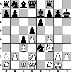 game notation in PGN-format [Event "Mal wieder spielen 2"] [Site "www.myChess.de"] [Date "2013.05.12"] [Round "1"] [White "Seneca"] [Black "Ziegert"] [ECO "D00"] [WhitemyELO "1570"] [BlackmyELO "1571"] [Result "0-1"] [TimeControl "10/1728000"] [WhiteDays "39"] [BlackDays "28"] [MyChessNo "88297"] 1. d4 d5 2. e3 e6 3. Bd3 Nf6 4. Nd2 Be7 5. f4 O-O 6. Ngf3 c5 7. c3 c4 8. Bc2 Ng4 9. O-O Nxe3 10. Bxh7+ Kxh7 0-1 position notation in FEN-format rnbq1r2/pp2bppk/4p3/3p4/2pP1P2/2P1nN2/PP1N2PP/R1BQ1RK1 - - - 0 11 Captured white pieces: Captured black pieces: Click on a captured piece in order to display the desired move!