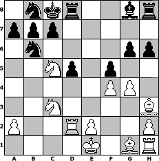 game notation in PGN-format [Event "Chess960 f"] [Site "www.myChess.de"] [Date "2013.03.24"] [Round "1"] [White "MathiasNowak"] [Black "espero"] [Variant "Fischerrandom"] [SetUp "1"] [FEN "nnqrkbbr/pppppppp/8/8/8/8/PPPPPPPP/NNQRKBBR w KQkq - 0 1"] [WhitemyELO "1922"] [BlackmyELO "1727"] [Result "1-0"] [TimeControl "10/2592000"] [WhiteDays "22"] [BlackDays "30"] [MyChessNo "87400"] 1. Nb3 e5 2. d4 exd4 3. Nxd4 d5 4. Qe3+ Be7 5. Qf4 h6 6. Nf5 Bf6 7. g3 Qe6 8. Bh3 Qe5 9. Qxe5+ Bxe5 10. f4 Bxb2 11. c3 g6 12. Rd2 Ba1 13. Nd4 f5 14. Nb3 Bxc3 15. Nxc3 Nb6 16. Nc5 O-O-O 17. g4 1-0 position notation in FEN-format 1nkr2br/ppp5/1n4pp/2Np1p2/5PP1/2N4B/P2RP2P/4K1BR - K - 0 17 Captured white pieces: Captured black pieces: Click on a captured piece in order to display the desired move!