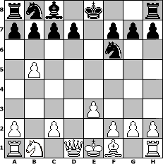 game notation in PGN-format [Event "Auf Die WM!!!!!!!!!!!! (2010 werden wir Meister)"] [Site "www.myChess.de"] [Date "2006.07.21"] [Round "1"] [White "tschulz"] [Black "Martin2008"] [ECO "A00"] [WhitemyELO "1577"] [BlackmyELO "1429"] [Result "1-0"] [TimeControl "10/2592000"] [WhiteDays "28"] [BlackDays "00"] [MyChessNo "27062"] 1. b4 e5 2. Bb2 Qf6 3. b5 Bc5 4. Nf3 Bd4 5. Nxd4 exd4 6. e3 dxe3 7. Bxf6 Nxf6 8. dxe3 1-0 position notation in FEN-format rnb1k2r/pppp1ppp/5n2/1P6/8/4P3/P1P2PPP/RN1QKB1R - KQkq - 0 8 Captured white pieces: Captured black pieces: Click on a captured piece in order to display the desired move!