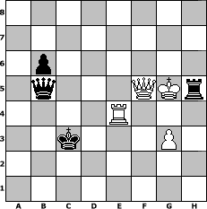 game notation in PGN-format [Event "Februar 2018"] [Site "www.myChess.de"] [Date "2018.02.03"] [Round "1"] [White "wolni55"] [Black "Andylein1989"] [ECO "C50"] [WhitemyELO "1464"] [BlackmyELO "1677"] [Result "0-1"] [TimeControl "10/1728000"] [WhiteDays "122"] [BlackDays "139"] [MyChessNo "111301"] 1. e4 e5 2. Nf3 Nc6 3. Bc4 Be7 4. d3 d6 5. h3 Be6 6. Bxe6 fxe6 7. a3 Nf6 8. Be3 d5 9. c3 dxe4 10. Ng5 Qxd3 11. Qxd3 exd3 12. Nxe6 Kd7 13. Nc5+ Bxc5 14. Bxc5 Rad8 15. O-O Kc8 16. Rd1 e4 17. b4 b6 18. Be3 Rhe8 19. Nd2 Nd5 20. Bg5 Rd7 21. Re1 Nxc3 22. Rac1 Ne2+ 23. Kh2 Nxc1 24. Rxc1 Nd4 25. Be3 Nc2 26. Nc4 Re6 27. b5 Rd5 28. a4 Nxe3 29. Nxe3 Rd4 30. Ra1 Rf6 31. Ng4 Rfd6 32. Ne3 g6 33. a5 Rb4 34. axb6 axb6 35. Ra8+ Kb7 36. Rh8 d2 37. Rxh7 d1=Q 38. Nxd1 Rxd1 39. Rg7 Rxb5 40. Rxg6 Rb2 41. Re6 Re1 42. Kg3 Ree2 43. Rf6 Rb3+ 44. Kh2 c5 45. h4 c4 46. h5 c3 47. h6 c2 48. h7 c1=Q 49. Rf7+ Ka6 50. h8=Q Qc6 51. Qa1+ Kb5 52. Rf5+ Kc4 53. Qa6+ Kd4 54. Qxe2 Qc7+ 55. g3 Qc4 56. Qg4 Kc3 57. Rf4 Rb2 58. Rxe4 Rxf2+ 59. Kh3 Qf1+ 60. Kh4 Rh2+ 61. Kg5 Qb5+ 62. Qf5 Rh5+ 0-1 position notation in FEN-format 8/8/1p6/1q3QKr/4R3/2k3P1/8/8 - - - 8 63 Captured white pieces: Captured black pieces: Click on a captured piece in order to display the desired move!