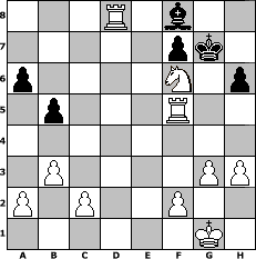 game notation in PGN-format [Event "> 1500"] [Site "www.myChess.de"] [Date "2010.03.18"] [Round "1"] [White "hape50"] [Black "gunni50"] [ECO "A45"] [WhitemyELO "1238"] [BlackmyELO "1307"] [Result "1-0"] [TimeControl "10/2592000"] [WhiteDays "120"] [BlackDays "112"] [MyChessNo "64086"] 1. d4 Nf6 2. Nc3 g6 3. e4 d6 4. h3 Bg7 5. Nf3 O-O 6. Be3 c6 7. Bd3 Nbd7 8. O-O e5 9. Re1 exd4 10. Nxd4 a6 11. Qd2 c5 12. Nf3 b5 13. b3 Bb7 14. Rab1 Rb8 15. Ne2 Nxe4 16. Bxe4 Bxe4 17. Ng5 Ne5 18. Nxe4 d5 19. Nxc5 Qf6 20. Bd4 Qf5 21. Bxe5 Qxe5 22. Nd7 Qe8 23. Nxb8 Qxb8 24. Qxd5 Rd8 25. Qe4 Re8 26. Qc6 Re6 27. Qd7 Rd6 28. Qg4 Rf6 29. Ng3 Bf8 30. Qd7 Qf4 31. Ne4 Rf5 32. Rbd1 Re5 33. g3 Qf3 34. Rd3 Qf5 35. Qxf5 gxf5 36. Nf6+ Kh8 37. Rxe5 h6 38. Rd8 Kg7 39. Rxf5 1-0 position notation in FEN-format 3R1b2/5pk1/p4N1p/1p3R2/8/1P4PP/P1P2P2/6K1 - - - 0 39 Captured white pieces: Captured black pieces: Click on a captured piece in order to display the desired move!