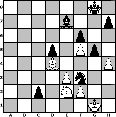 game notation in PGN-format [Event "2. Chess960/1"] [Site "www.myChess.de"] [Date "2008.03.15"] [Round "1"] [White "BirdofPray1"] [Black "Offi@ (adv.)"] [Variant "Fischerrandom"] [SetUp "1"] [FEN "rqnbbknr/pppppppp/8/8/8/8/PPPPPPPP/RQNBBKNR w KQkq - 0 1"] [WhitemyELO "2240"] [BlackmyELO "1500"] [Result "0-1"] [TimeControl "10/3456000"] [WhiteDays "156"] [BlackDays "182"] [MyChessNo "43416"] 1. c4 c5 2. d3 e6 3. Nf3 d6 4. O-O Bf6 5. e3 Nge7 6. Ne2 b5 7. cxb5 Bxb5 8. Qc2 O-O 9. Rb1 Nb6 10. Nc3 Nbd5 11. Ne4 a5 12. Be2 Nc6 13. a3 Rc8 14. Bc3 Be7 15. Rfc1 a4 16. b3 Qa7 17. Ba1 Rab8 18. bxa4 Bxa4 19. Qa2 Na5 20. Ned2 Nb6 21. Bc3 Be8 22. d4 Na4 23. Rxb8 Rxb8 24. Ba1 Nc6 25. d5 exd5 26. Qxd5 Nb6 27. Qd3 d5 28. Ne5 c4 29. Qf5 Qxa3 30. Rd1 g6 31. Qf4 Rc8 32. Nxc6 Rxc6 33. Bd4 Qd6 34. Qh6 f6 35. Rc1 Qe6 36. Ra1 g5 37. g4 c3 38. Nb3 c2 39. Qh3 Nc4 40. Bd3 Bg6 41. Ra8+ Rc8 42. Bf5 Bxf5 43. gxf5 Qc6 44. Ra7 Rc7 45. Rxc7 Qxc7 46. Qh5 Qb7 47. h4 Nd2 48. Nc1 Qb5 49. Qe2 Qxe2 50. Nxe2 Nf3+ 0-1 position notation in FEN-format 6k1/4b2p/5p2/3p1Pp1/3B3P/4Pn2/2p1NP2/6K1 - - - 1 51 Captured white pieces: Captured black pieces: Click on a captured piece in order to display the desired move!