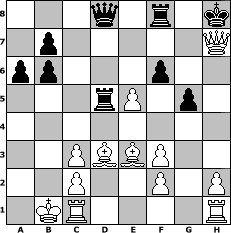 game notation in PGN-format [Event "Unser WM-Turnier"] [Site "www.myChess.de"] [Date "2018.07.07"] [Round "1"] [White "tiano"] [Black "augustus"] [ECO "A15"] [WhitemyELO "1561"] [BlackmyELO "1073"] [Result "1-0"] [TimeControl "10/3456000"] [WhiteDays "35"] [BlackDays "39"] [MyChessNo "112573"] 1. c4 Nf6 2. d4 d5 3. cxd5 Nxd5 4. Nf3 f6 5. e4 Nb6 6. Be3 Bg4 7. Qb3 Bxf3 8. gxf3 Qd7 9. a4 e6 10. a5 Na6 11. axb6 cxb6 12. Nc3 Bb4 13. O-O-O Rc8 14. Kb1 O-O 15. Bxa6 Bxc3 16. Bb5 Qc7 17. Qxe6+ Kh8 18. Rc1 Qd8 19. bxc3 a6 20. Bd3 Rc6 21. Qh3 g5 22. d5 Rd6 23. e5 Rxd5 24. Qxh7# 1-0 position notation in FEN-format 3q1r1k/1p5Q/pp3p2/3rP1p1/8/2PBBP2/2P2P1P/1KR4R - - - 0 24 Captured white pieces: Captured black pieces: Click on a captured piece in order to display the desired move!