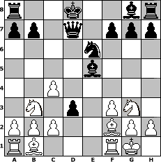 game notation in PGN-format [Event "Wanderpokal April - Chess960"] [Site "www.myChess.de"] [Date "2006.04.01"] [Round "1"] [White "Matthias"] [Black "bane"] [Variant "Fischerrandom"] [SetUp "1"] [FEN "rbnkqnbr/pppppppp/8/8/8/8/PPPPPPPP/RBNKQNBR w KQkq - 0 1"] [WhitemyELO "1261"] [BlackmyELO "1929"] [Result "0-1"] [TimeControl "10/86400"] [WhiteDays "02"] [BlackDays "02"] [MyChessNo "24203"] 1. f3 d5 2. d3 e5 3. Ng3 d4 4. Nb3 Ne6 5. e3 c5 6. exd4 cxd4 7. Qe4 Qd7 8. Bf2 Nd6 9. Qxe5 Nc4 10. dxc4 Bxe5 11. O-O d3 0-1 position notation in FEN-format r2k2br/pp1q1ppp/4n3/4b3/2P5/1N1p1PN1/PPP2BPP/RB3RK1 - kq - 0 12 Captured white pieces: Captured black pieces: Click on a captured piece in order to display the desired move!