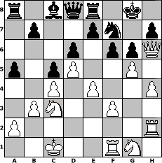 game notation in PGN-format [Event "Neujahrsturnier 2016"] [Site "www.myChess.de"] [Date "2015.12.17"] [Round "1"] [White "kalle"] [Black "martinus"] [ECO "A53"] [WhitemyELO "1646"] [BlackmyELO "1803"] [Result "0-1"] [TimeControl "10/2592000"] [WhiteDays "47"] [BlackDays "52"] [MyChessNo "101682"] 1. d4 Nf6 2. c4 d6 3. Nc3 g6 4. e4 Bg7 5. f3 O-O 6. Be3 Re8 7. Qd2 Nc6 8. d5 Ne5 9. O-O-O c6 10. Bh6 c5 11. h4 Nh5 12. g4 Bxh6 13. Qxh6 Ng3 14. Rh2 Nxf1 15. Rxf1 f6 16. b3 a5 17. g5 Nf7 0-1 position notation in FEN-format r1bqr1k1/1p2pn1p/3p1ppQ/p1pP2P1/2P1P2P/1PN2P2/P6R/2K2RN1 - - - 1 18 Captured white pieces: Captured black pieces: Click on a captured piece in order to display the desired move!