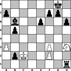 game notation in PGN-format [Event "Albspiele 21"] [Site "www.myChess.de"] [Date "2012.05.10"] [Round "1"] [White "Winston"] [Black "JerryWho"] [ECO "B12"] [WhitemyELO "1474"] [BlackmyELO "1597"] [Result "0-1"] [TimeControl "10/1728000"] [WhiteDays "20"] [BlackDays "20"] [MyChessNo "81656"] 1. e4 c6 2. d4 d5 3. e5 Bf5 4. h3 e6 5. a3 c5 6. Nf3 cxd4 7. Nxd4 Bg6 8. Bb5+ Nd7 9. Nd2 Bc5 10. N2b3 Bb6 11. O-O Ne7 12. Bg5 O-O 13. Bxd7 Qxd7 14. Nf3 Rac8 15. c3 h6 16. Bd2 Nc6 17. c4 dxc4 18. Nc1 Bh5 19. Ne2 Bxf3 20. gxf3 Nxe5 21. Kg2 Qc6 22. Ng1 Rfd8 23. Qe2 Nd3 24. Be3 Bc7 25. h4 Qd6 26. Rfd1 Nf4+ 27. Bxf4 Qxf4 28. Rxd8+ Rxd8 29. Qe1 Qxh4 30. Nh3 Qd4 31. Qb4 Qd6 32. Qxd6 Rxd6 33. Ng1 Rd2 34. Rc1 b5 35. b3 Bb6 36. Nh3 cxb3 37. Kf1 b2 38. Rb1 Rc2 39. Ke1 Rc1+ 40. Kd2 Rxb1 41. Kc2 Rh1 0-1 position notation in FEN-format 6k1/p4pp1/1b2p2p/1p6/8/P4P1N/1pK2P2/7r - - - 2 42 Captured white pieces: Captured black pieces: Click on a captured piece in order to display the desired move!