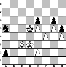game notation in PGN-format [Event "Nach dem Weltuntergang 2012"] [Site "www.myChess.de"] [Date "2012.12.27"] [Round "1"] [White "Stecher1966"] [Black "espero"] [ECO "B06"] [WhitemyELO "1501"] [BlackmyELO "1771"] [Result "0-1"] [TimeControl "10/864000"] [WhiteDays "10"] [BlackDays "10"] [MyChessNo "85681"] 1. e4 g6 2. c3 Bg7 3. d4 d5 4. e5 c5 5. h3 Nc6 6. Nf3 cxd4 7. cxd4 Nh6 8. Bb5 O-O 9. O-O Qb6 10. Bxc6 bxc6 11. Nc3 Ba6 12. Re1 Bb5 13. Nxb5 cxb5 14. Be3 Nf5 15. Bf4 e6 16. Qd2 Rac8 17. Rec1 Rc4 18. Rxc4 bxc4 19. Qc3 Rb8 20. Rb1 a5 21. g4 Ne7 22. Kh2 h6 23. h4 Qb4 24. Qc2 Nc6 25. Qc1 Kh7 26. Bd2 Qb6 27. Bc3 a4 28. a3 Qd8 29. Qf4 Kg8 30. Kg3 Rb7 31. Qd2 Kh7 32. Re1 Rb3 33. Re3 Na7 34. Ba5 Qb8 35. Rxb3 Qxb3 36. Qb4 Qxb4 37. Bxb4 Nb5 38. Kf4 Kg8 39. Ke3 f6 40. Bc3 fxe5 41. Nxe5 Bxe5 42. dxe5 h5 43. g5 Kf7 44. f4 Ke7 45. Bd4 Kd7 46. Bc3 Kc6 47. Be1 d4+ 48. Ke4 c3 49. bxc3 dxc3 50. Kd3 Kd5 51. Bxc3 Nxa3 52. Bd4 Nb5 53. Be3 a3 54. Bc1 a2 55. Bb2 Na3 56. Ba1 Nc4 57. Bc3 Na5 0-1 position notation in FEN-format 8/8/4p1p1/n2kP1Pp/5P1P/2BK4/p3P3/8 - - - 6 58 Captured white pieces: Captured black pieces: Click on a captured piece in order to display the desired move!