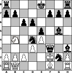 game notation in PGN-format [Event "Turnier zum Tag der deutschen Einheit 2015"] [Site "www.myChess.de"] [Date "2015.10.03"] [Round "1"] [White "Haneken"] [Black "paul"] [ECO "C20"] [WhitemyELO "1052"] [BlackmyELO "1348"] [Result "0-1"] [TimeControl "10/1728000"] [WhiteDays "38"] [BlackDays "25"] [MyChessNo "100633"] 1. e4 e5 2. d3 Nc6 3. Nh3 Nf6 4. Bg5 Be7 5. Nc3 d6 6. Qf3 Nd4 7. Qd1 Ng4 8. Nd5 Bxg5 9. Be2 c6 10. Nb4 Qf6 11. f3 Ne3 12. Qb1 Nxg2+ 13. Kf2 Bxh3 14. Bf1 Qxf3+ 0-1 position notation in FEN-format r3k2r/pp3ppp/2pp4/4p1b1/1N1nP3/3P1q1b/PPP2KnP/RQ3B1R - kq - 0 15 Captured white pieces: Captured black pieces: Click on a captured piece in order to display the desired move!