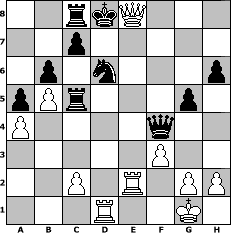 | game notation in PGN-format [Event "1-2009"] [Site "www.myChess.de"] [Date "2009.01.01"] [Round "1"] [White "Andreas"] [Black "Gauss1233"] [ECO "B01"] [WhitemyELO "1509"] [BlackmyELO "1408"] [Result "1-0"] [TimeControl "10/1728000"] [WhiteDays "79"] [BlackDays "65"] [MyChessNo "51200"] 1. e4 d5 2. exd5 Qxd5 3. Nc3 Qd8 4. Nf3 e6 5. d4 h6 6. Bc4 Bb4 7. O-O Nf6 8. Bd2 O-O 9. a3 Ba5 10. Ne2 Bxd2 11. Qxd2 Ne4 12. Qd3 Nd6 13. Bb3 Nc6 14. d5 Na5 15. Ba2 b6 16. Ned4 Qf6 17. b4 Nab7 18. dxe6 fxe6 19. Rae1 Re8 20. Re2 Nd8 21. Rfe1 a5 22. b5 Bd7 23. a4 Kf7 24. Ne5+ Ke7 25. Bd5 Rb8 26. Nec6+ Nxc6 27. Bxc6 Rbc8 28. Bxd7 Kxd7 29. Nc6 Qf5 30. Ne5+ Kd8 31. Nc6+ Kd7 32. Qg3 g5 33. Nd4 Qf4 34. Qc3 e5 35. Nf3 e4 36. Nd2 Re5 37. Qc6+ Kd8 38. Nxe4 Nxe4 39. f3 Rc5 40. Rd1+ Nd6 41. Qe8# 1-0 position notation in FEN-format 2rkQ3/2p5/1p1n3p/pPr3p1/P4q2/5P2/2P1R1PP/3R2K1 - - - 4 41 Captured white pieces:                              Captured black pieces:                               Click on a captured piece in order to display the desired move!