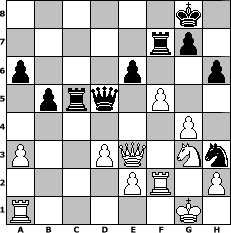 game notation in PGN-format [Event "Schachturnier Eins"] [Site "www.myChess.de"] [Date "2015.11.01"] [Round "1"] [White "Andylein1989"] [Black "Seneca"] [ECO "C41"] [WhitemyELO "1532"] [BlackmyELO "1471"] [Result "0-1"] [TimeControl "10/1728000"] [WhiteDays "19"] [BlackDays "19"] [MyChessNo "101063"] 1. e4 e5 2. Nf3 d6 3. Bc4 Be6 4. Bxe6 fxe6 5. O-O h6 6. d3 Nf6 7. Nbd2 Nc6 8. Re1 Be7 9. Nf1 O-O 10. Ng3 Nh7 11. Bd2 a6 12. Qc1 Nd4 13. Nxd4 exd4 14. e5 d5 15. Nh5 Bg5 16. f4 Be7 17. a3 Rf7 18. Rf1 c5 19. Rf3 b5 20. c3 dxc3 21. bxc3 Rf5 22. g4 Rf7 23. Ng3 d4 24. f5 Qd5 25. Rf2 Qxe5 26. Bf4 Qd5 27. cxd4 Rc8 28. dxc5 Bxc5 29. Be3 Ng5 30. Bxc5 Rxc5 31. Qe3 Nh3+ 0-1 position notation in FEN-format 6k1/5rp1/p3p2p/1prq1P2/6P1/P2PQ1Nn/4PR1P/R5K1 - - - 2 32 Captured white pieces: Captured black pieces: Click on a captured piece in order to display the desired move!