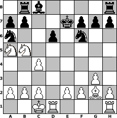 game notation in PGN-format [Event "4. Norderstedter DENK MAL Open 2013"] [Site "www.myChess.de"] [Date "2013.01.09"] [Round "1"] [White "haggard"] [Black "sprinterde"] [ECO "A20"] [WhitemyELO "1985"] [BlackmyELO "1686"] [Result "1-0"] [TimeControl "10/2592000"] [WhiteDays "30"] [BlackDays "29"] [MyChessNo "86037"] 1. c4 e5 2. g3 Nf6 3. Bg2 c6 4. d4 Bb4+ 5. Bd2 Bxd2+ 6. Qxd2 Qe7 7. dxe5 Qxe5 8. Nf3 Qc5 9. Qd4 Qxd4 10. Nxd4 Na6 11. Nc3 d6 12. Nxc6 Kd7 13. Na5 Rb8 14. O-O-O Ke7 15. Nb5 1-0 position notation in FEN-format 1rb4r/pp2kppp/n2p1n2/NN6/2P5/6P1/PPP1PPBP/2KR3R - - - 6 15 Captured white pieces: Captured black pieces: Click on a captured piece in order to display the desired move!
