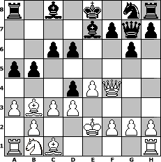 game notation in PGN-format [Event "Godzilla Mannschaftsturnier 2013"] [Site "www.myChess.de"] [Date "2013.08.15"] [Round "1"] [Board "4"] [White "Verena"] [Black "Lydia"] [ECO "C61"] [WhitemyELO "1486"] [BlackmyELO "1601"] [Result "1-0"] [TimeControl "10/3456000"] [WhiteDays "34"] [BlackDays "32"] [MyChessNo "89729"] 1. e4 e5 2. Nf3 Nc6 3. Bb5 Nd4 4. Nxd4 exd4 5. d3 c6 6. Ba4 Qf6 7. Qh5 g6 8. Qg5 Bb4+ 9. Kd1 a5 10. a3 Be7 11. Qf4 d6 12. c3 Qg7 13. Ke2 b5 14. Bb3 1-0 position notation in FEN-format r1b1k1nr/4bpqp/2pp2p1/pp6/3pPQ2/PBPP4/1P2KPPP/RNB4R - kq - 1 14 Captured white pieces: Captured black pieces: Click on a captured piece in order to display the desired move!