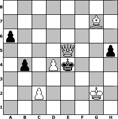 game notation in PGN-format [Event "mySchach.de - 1. Turnier 2003"] [Site "www.myChess.de"] [Date "2003.07.25"] [Round "1"] [White "Chaos"] [Black "gichtwicht"] [ECO "C57"] [WhitemyELO "1613"] [BlackmyELO "1547"] [Result "1-0"] [TimeControl "10/2592000"] [WhiteDays "176"] [BlackDays "173"] [MyChessNo "386"] 1. e4 e5 2. Nf3 Nc6 3. Bc4 Nf6 4. Ng5 d5 5. exd5 Nxd5 6. Nxf7 Kxf7 7. Qf3+ Ke6 8. Nc3 Ncb4 9. O-O Bc5 10. a3 Rf8 11. Qe4 Rf4 12. Qe2 Qf6 13. axb4 Bxb4 14. Nxd5 Qh4 15. Nxf4+ Kf5 16. Bd3+ Kg5 17. Qxe5+ Kh6 18. Be4 Bd6 19. Qh5+ Qxh5 20. Nxh5 Kxh5 21. d3 g6 22. Ra5+ c5 23. b4 b6 24. Rxc5+ bxc5 25. Bxa8 cxb4 26. h3 g5 27. f4 g4 28. f5 gxh3 29. f6 Kg6 30. Be4+ Kf7 31. gxh3 Bxh3 32. Bd5+ Kg6 33. Rf3 Bg4 34. Rf1 Bh3 35. Be4+ Kf7 36. Be3 a6 37. Ra1 Bc8 38. Bd4 h6 39. Bd5+ Kf8 40. f7 Ke7 41. Re1+ Kd7 42. Be6+ Kd8 43. Bxc8 Kxc8 44. Bg7 Bc5+ 45. Kg2 h5 46. d4 Bd6 47. Re6 Kd7 48. Rxd6+ Kxd6 49. f8=Q+ Kd5 50. Qc5+ Ke4 51. Qe5# 1-0 position notation in FEN-format 8/6B1/p7/4Q2p/1p1Pk3/8/2P3K1/8 - - - 4 51 Captured white pieces: ![]() ![]() ![]() ![]() ![]() ![]() ![]() ![]() ![]() ![]() ![]() ![]() ![]() ![]() ![]() Captured black pieces: ![]() ![]() ![]() ![]() ![]() ![]() ![]() ![]() ![]() ![]() ![]() ![]() ![]() ![]() ![]() Click on a captured piece in order to display the desired move!